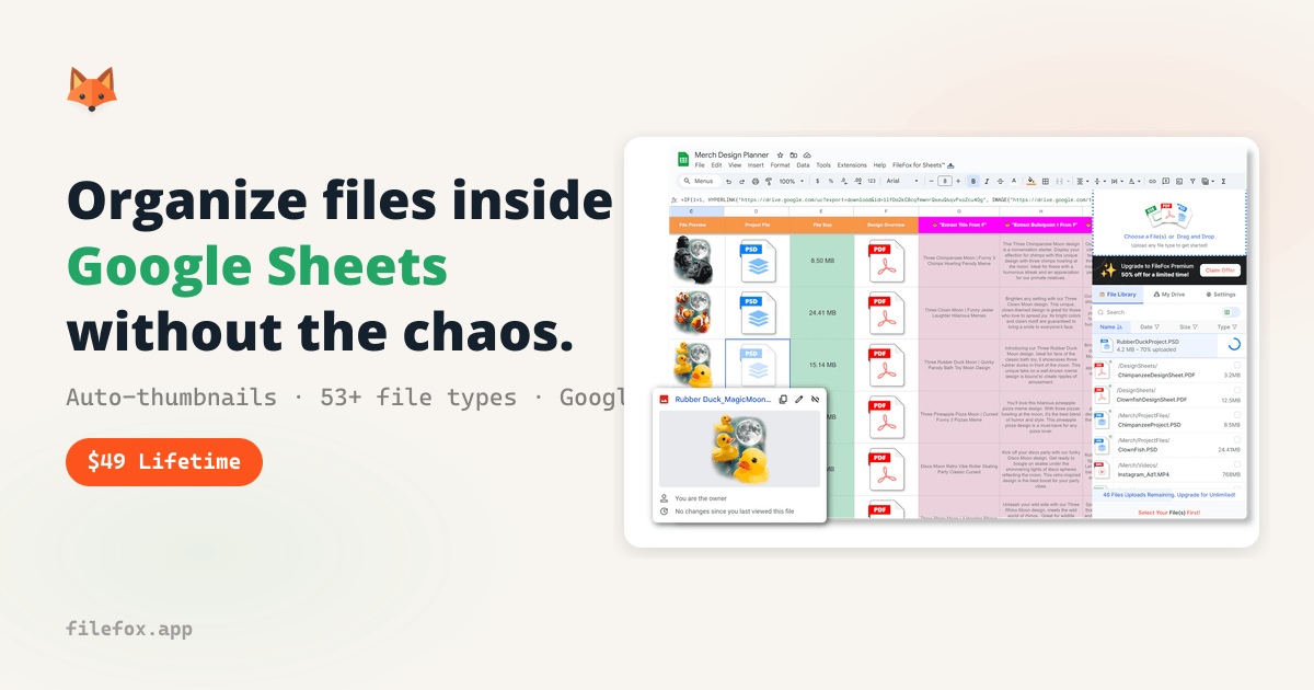 FileFox is a Google Sheets add-on that lets you drag & drop files directly into spreadsheets. Auto-thumbnails for any file type, Google Drive sync. $49 one-time lifetime license.